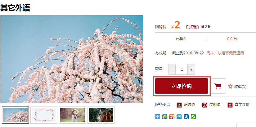 1, 抢购:在您想要团购的商品详情页,点击"立即抢购"。